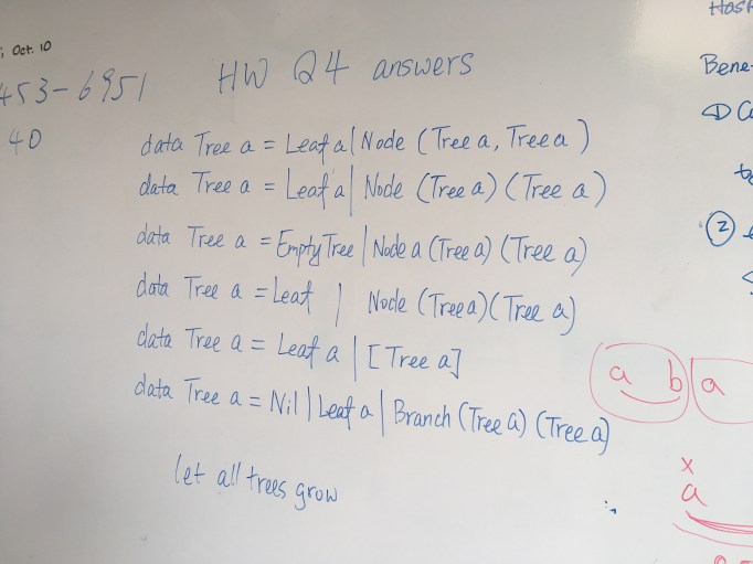Tree type definitions in Haskell as answers to a homework question of CSC 253/453. They make a good demonstration how a type system can be used by a programmer to communicate its program design to the compiler, so the compiler can check correctness of the implementation automatically.
